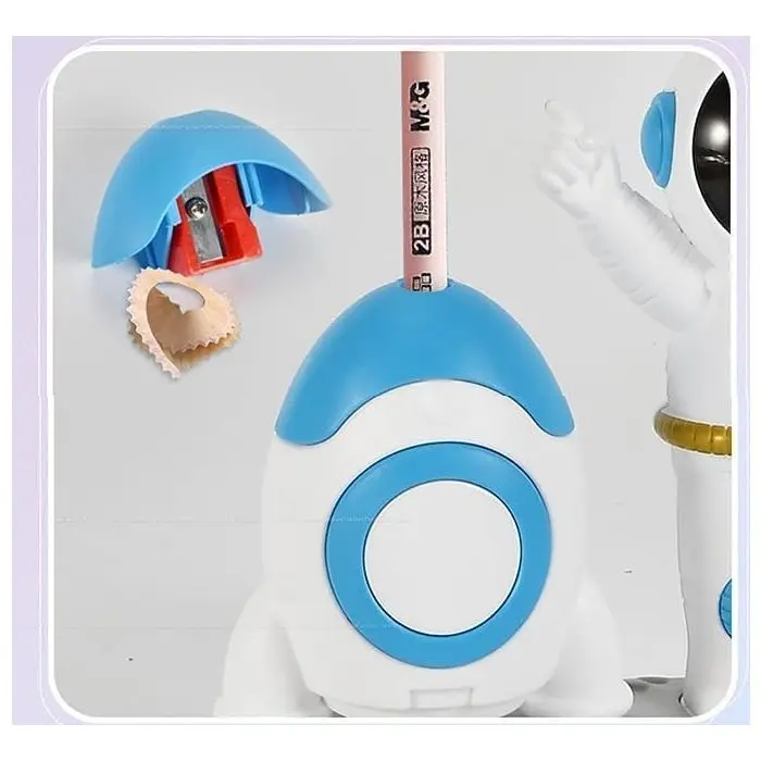 Funcional: incluye sacapuntas y porta lápices en la nave acompañante.